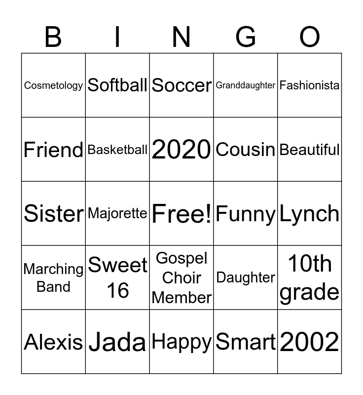 This bingo card has a free space and 29 words: Alexis, February 26th, Majorette, Artist, Cosmetology, Soccer, Basketball, Sweet 16, Funny, Jada, Lynch, 2002, Happy, Smart, Beautiful, Praise Dancer, Gospel Choir Member, Marching Band, Fashionista, Sister, Daughter, Niece, Cousin, Friend, Granddaughter, Softball, 10th grade, 2020 and Honor Roll.