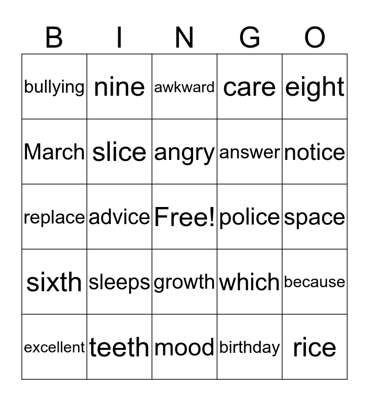 This bingo card has a free space and 51 words: ten, rice, nice, mood, sleeps, likes, nine, until, March, price, slice, care, because, which, twice, splice, angry, police, social, eight, advice, birthday, bullying, answer, values, worried, notice, practice, excellent, awkward, face, ace, pace, lace, trace, teeth, happy, making, brain, dance, space, sixth, tenth, ninth, tried, necklace, replace, family, twenty, growth and palace.