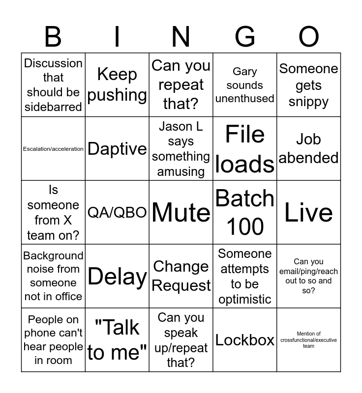 This bingo card has a free space and 24 words: Delay, "Talk to me", Jason L says something amusing, People on phone can't hear people in room, Someone gets snippy, Discussion that should be sidebarred, Escalation/acceleration, Keep pushing, Batch 100, Change Request, File loads, Is someone from X team on?, Someone attempts to be optimistic, Can you email/ping/reach out to so and so?, Daptive, Lockbox, Live, Can you repeat that?, Job abended, QA/QBO, Mention of crossfunctional/executive team, Background noise from someone not in office, Gary sounds unenthused and Can you speak up/repeat that?.