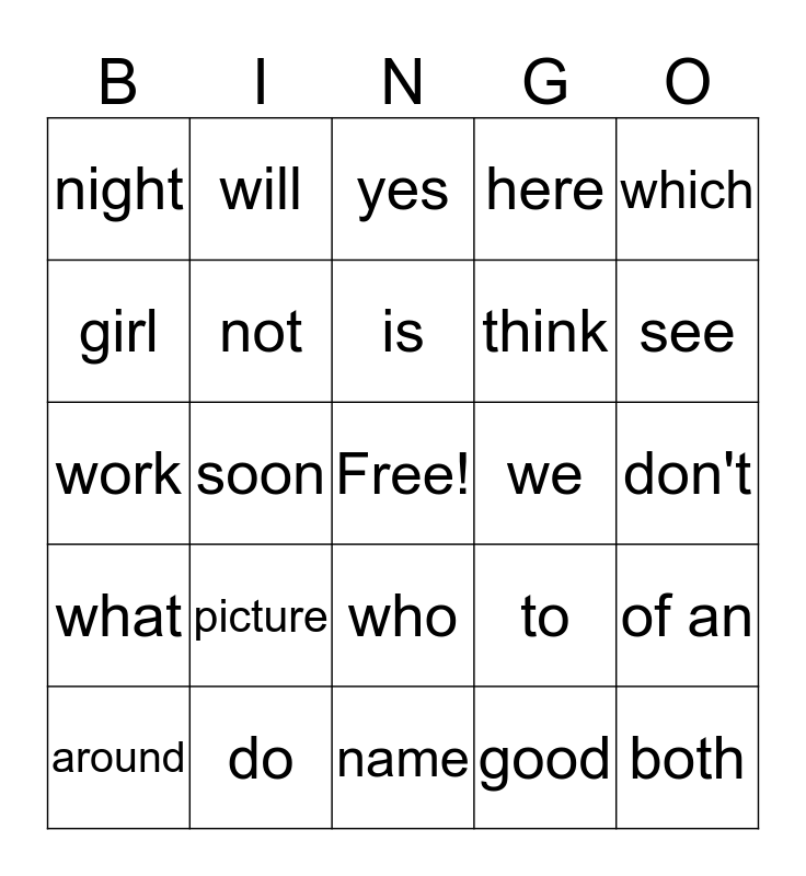 This bingo card has a free space and 72 words: in, will, soon, year, on, where, here, later, think, take, around, letter, see, night, give, work, to, which, for, don't, picture, both, of an, those, how, does, some, a, these, like, do, food, are, and, good, book, write, she, girl, tomorrow, who, that, he, boy, day, what, pay, answer, they, at, time, can, read, we, point, it, yes, is, you, me, number, school, I, name, the, show, not, am, my, this, look and no.