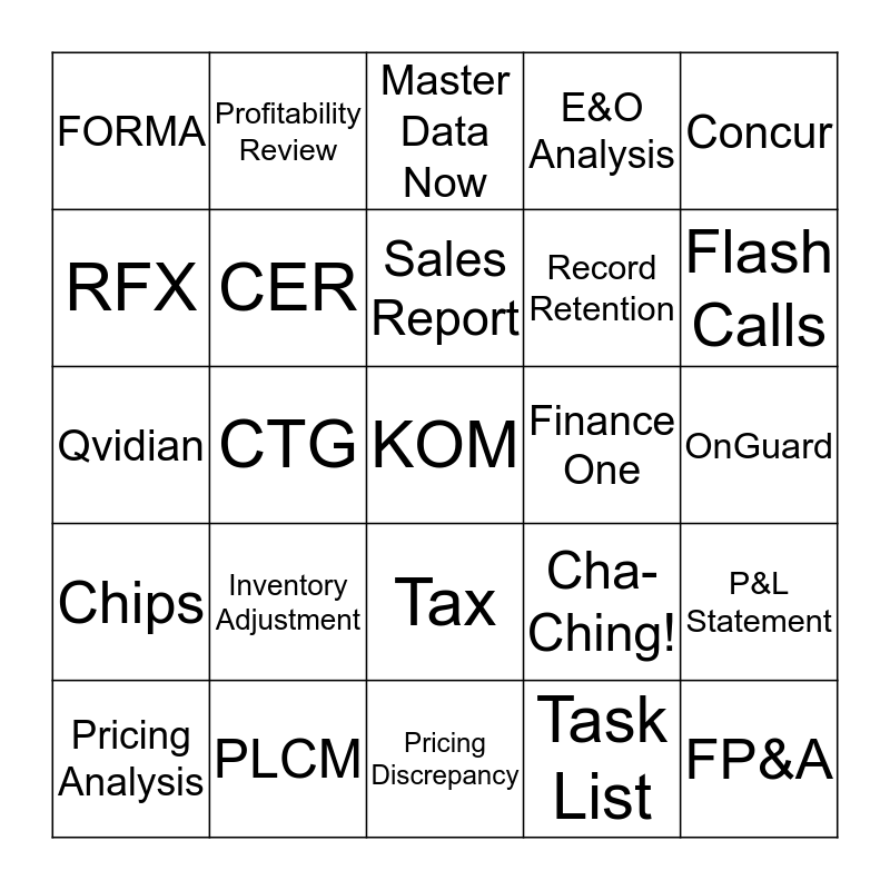 This bingo card has 36 words: ACAN, Accelerate, Budget, CER, Cha-Ching!, Chips, Sales Report, Commission, Concur, Contracts, CTG, E&O Analysis, Executive Summary, Finance One, Flash Calls, FORMA, FP&A, Inventory Adjustment, KOM, Master Data Now, OnGuard, P&L Statement, PLCM, Pricing Analysis, Pricing Discrepancy, Profitability Review, Qvidian, Rebate Cheques, Record Retention, RFX, SOX, Stryker Dollars, Task List, Tax, Value Add and AP.