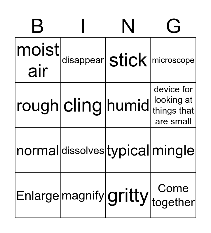 This bingo card has 16 words: magnify, mingle, stick, moist air, normal, disappear, typical, gritty, rough, cling, Enlarge, microscope, dissolves, device for looking at things that are small, humid and Come together.