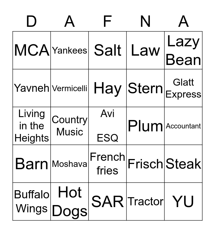 This bingo card has a free space and 24 words: Moshava, Hot Dogs, Hay, Buffalo Wings, Lazy Bean, MCA, Yavneh, Yankees, Plum, French fries, Stern, Living in the Heights, Frisch, Steak, Vermicelli, Tractor, Accountant, Salt, Glatt Express, Country Music, YU, Barn, Law and SAR.
