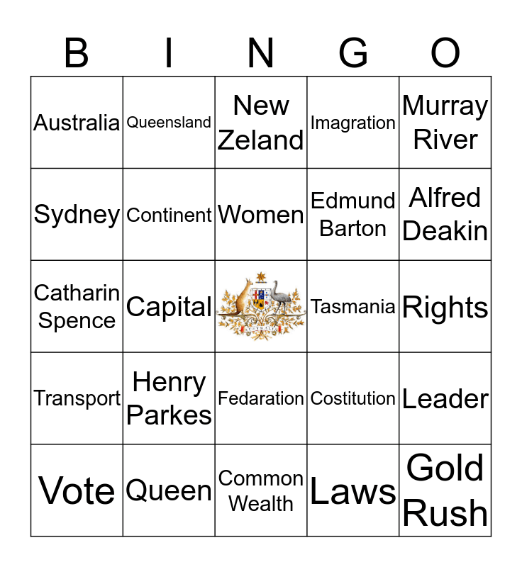 This bingo card has a free space and 24 words: Henry Parkes, Queen, Women, Vote, Murray River, Australia, Sydney, Queensland, Tasmania, Fedaration, Edmund Barton, Catharin Spence, Costitution, Leader, Continent, Laws, Rights, New Zeland, Alfred Deakin, Capital, Gold Rush, Transport, Imagration and Common Wealth.