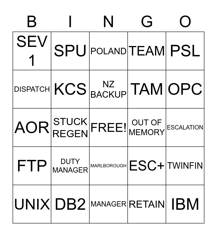 This bingo card has a free space and 53 words: Netezza, IBM, ICSW, RETAIN, DUTY MANAGER, FAILED BATTERY, SPU, NPS UPGRADE, DISPATCH, QPP, KCS, STRIPER, TWINFIN, ESC+, ERT, UNIX, NZ BACKUP, OUT OF MEMORY, HUNG SYSTEM, PSL, STUCK REGEN, L2 ENGINEER, TAM, SEV 1, LINUX, DB2, IDAA, PMR, POC, OPC, PSAR, CRIT SIT, RTC, CRM, ACTION PLAN, CT, TEAM, MANAGER, POLAND, TRAINING, SYSTEM DOWN, SEV 2, ESCALATION, WARM TRANSFER, HAND OFF, MARLBOROUGH, BACKLOG, CUSTOMER, AOR, FTP, WEBEX, APD and BRIDGE CALL.