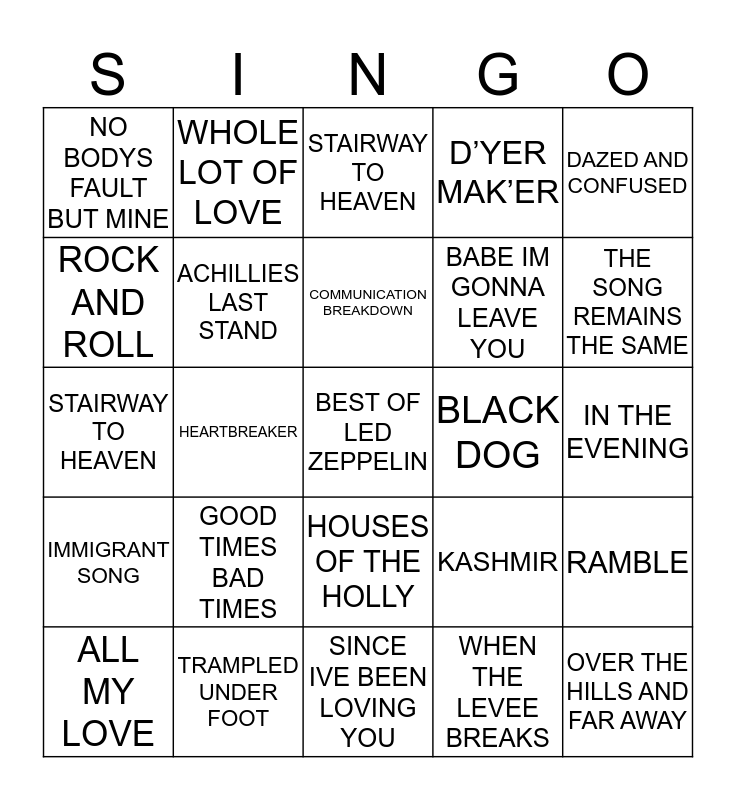 This bingo card has a free space and 24 words: GOOD TIMES BAD TIMES, TRAMPLED UNDER FOOT, COMMUNICATION BREAKDOWN, ALL MY LOVE, DAZED AND CONFUSED, NO BODYS FAULT BUT MINE, ROCK AND ROLL, WHOLE LOT OF LOVE, BLACK DOG, HOUSES OF THE HOLLY, BABE IM GONNA LEAVE YOU, STAIRWAY TO HEAVEN, KASHMIR, RAMBLE, ACHILLIES LAST STAND, WHEN THE LEVEE BREAKS, IN THE EVENING, STAIRWAY TO HEAVEN, THE SONG REMAINS THE SAME, HEARTBREAKER, OVER THE HILLS AND FAR AWAY, IMMIGRANT SONG, D’YER MAK’ER and SINCE IVE BEEN LOVING YOU.