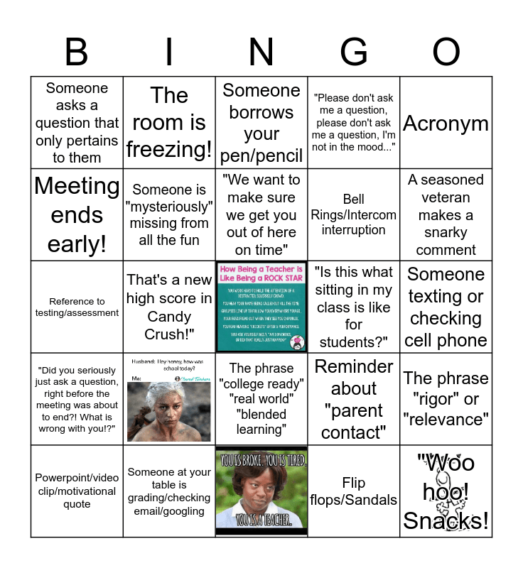 This bingo card has 3 images, a free space and 22 words: Someone at your table is grading/checking email/googling, "We want to make sure we get you out of here on time", Powerpoint/video clip/motivational quote, Acronym, Someone asks a question that only pertains to them, Meeting ends early!, The room is freezing!, "Is this what sitting in my class is like for students?", The phrase "college ready" "real world" "blended learning", Bell Rings/Intercom interruption, Reference to testing/assessment, Reminder about "parent contact", The phrase "rigor" or "relevance", Someone is "mysteriously" missing from all the fun, Flip flops/Sandals, Someone texting or checking cell phone, Someone borrows your pen/pencil, A seasoned veteran makes a snarky comment, That's a new high score in Candy Crush!", "Woo hoo! Snacks!, "Did you seriously just ask a question, right before the meeting was about to end?! What is wrong with you!?" and "Please don't ask me a question, please don't ask me a question, I'm not in the mood...".