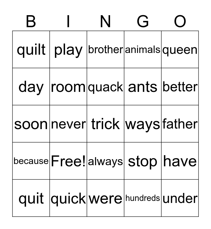 This bingo card has a free space and 24 words: Free!, quick, quack, quit, queen, quilt, day, play, ways, always, ants, soon, stop, have, room, hundreds, father, brother, better, never, under, because, animals and were.