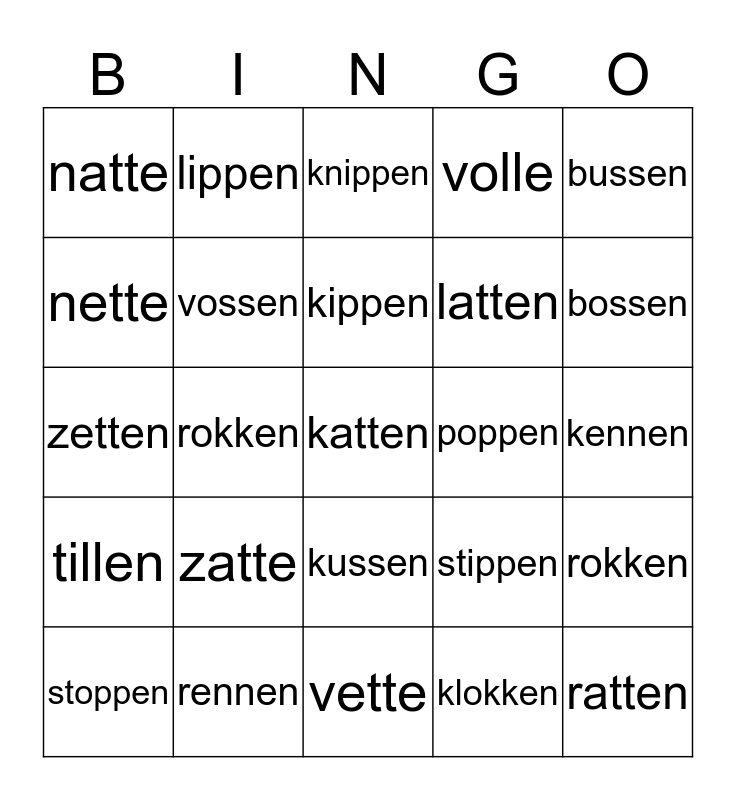 This bingo card has 25 words: zatte, vette, kippen, stoppen, bussen, natte, nette, lippen, poppen, kussen, latten, zetten, stippen, rokken, vossen, ratten, kennen, knippen, bossen, rokken, katten, rennen, tillen, volle and klokken.