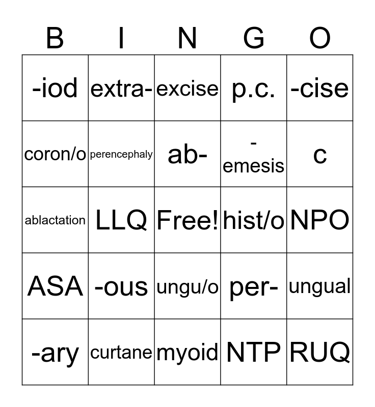 This bingo card has a free space and 24 words: -ous, curtane, ab-, -ary, -cise, -iod, coron/o, extra-, hist/o, ungu/o, -emesis, ablactation, per-, ungual, perencephaly, NTP, NPO, excise, c, LLQ, RUQ, ASA, p.c. and myoid.
