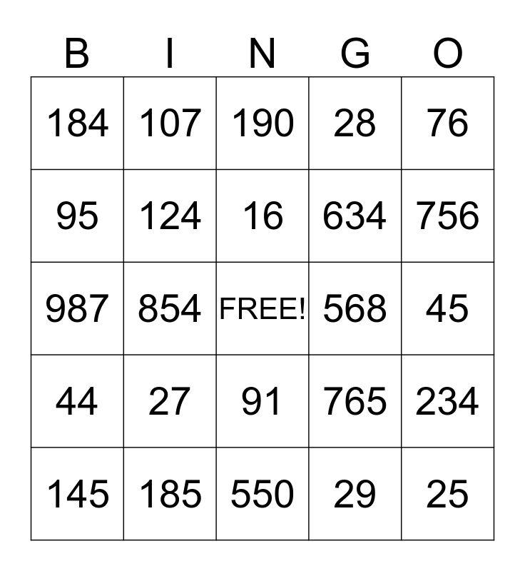 This bingo card has a free space and 24 words: 27, 185, 16, 145, 76, 184, 95, 107, 568, 91, 634, 987, 765, 234, 124, 29, 45, 190, 756, 854, 25, 44, 28 and 550.