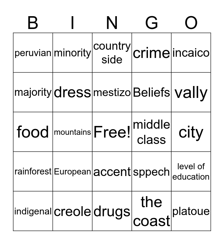 This bingo card has a free space and 24 words: European, creole, mestizo, indigenal, incaico, peruvian, majority, minority, middle class, accent, Beliefs, food, sppech, level of education, dress, the coast, city, country side, vally, mountains, platoue, rainforest, crime and drugs.