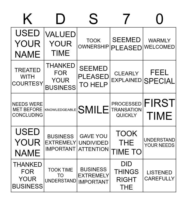 This bingo card has a free space and 24 words: BUSINESS EXTREMELY IMPORTANT, TOOK TIME TO UNDERSTAND, SEEMED PLEASED TO HELP, THANKED FOR YOUR BUSINESS, WARMLY WELCOMED, USED YOUR NAME, TREATED WITH COURTESY, VALUED YOUR TIME, PROCESSED TRANSATION QUICKLY, GAVE YOU UNDIVIDED ATTENTION, CLEARLY EXPLAINED, NEEDS WERE MET BEFORE CONCLUDING, TOOK THE TIME TO, UNDERSTAND YOUR NEEDS, THANKED FOR YOUR BUSINESS, DID THINGS RIGHT THE, FIRST TIME, TOOK OWNERSHIP, FEEL SPECIAL, KNOWLEDGEABLE, LISTENED CAREFULLY, USED YOUR NAME, SEEMED PLEASED and BUSINESS EXTREMELY IMPORTANT.
