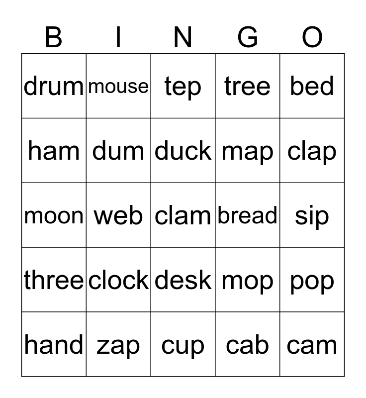 This bingo card has 25 words: clock, cup, duck, hand, bed, drum, ham, mouse, bread, desk, map, moon, mop, pop, dum, cam, sip, tep, clap, web, clam, zap, three, tree and cab.