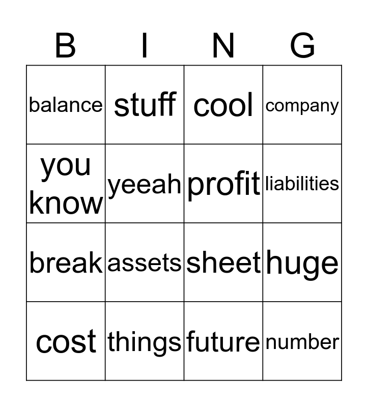 This bingo card has 16 words: things, huge, cool, balance, break, stuff, sheet, future, you know, yeeah, cost, company, assets, liabilities, profit and number.