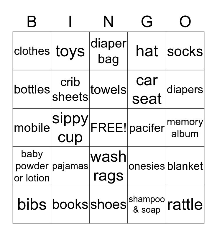 This bingo card has a free space and 24 words: pajamas, books, towels, bibs, socks, clothes, bottles, toys, pacifer, wash rags, car seat, mobile, onesies, blanket, crib sheets, shampoo & soap, memory album, diaper bag, diapers, sippy cup, rattle, baby powder or lotion, hat and shoes.