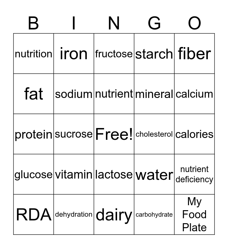 This bingo card has a free space and 24 words: vitamin, dehydration, nutrient, RDA, fiber, nutrition, fat, iron, cholesterol, lactose, mineral, protein, water, nutrient deficiency, sodium, carbohydrate, calories, fructose, calcium, sucrose, My Food Plate, glucose, starch and dairy.