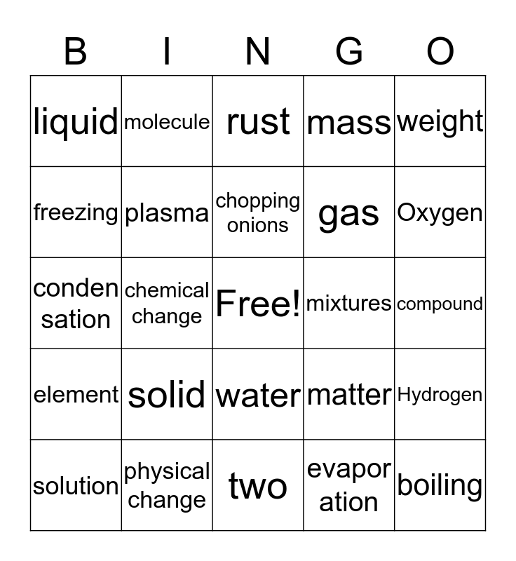 This bingo card has a free space and 24 words: solid, physical change, chopping onions, solution, weight, liquid, freezing, molecule, mixtures, water, gas, conden sation, matter, Hydrogen, plasma, evapor ation, compound, rust, Oxygen, chemical change, boiling, element, mass and two.