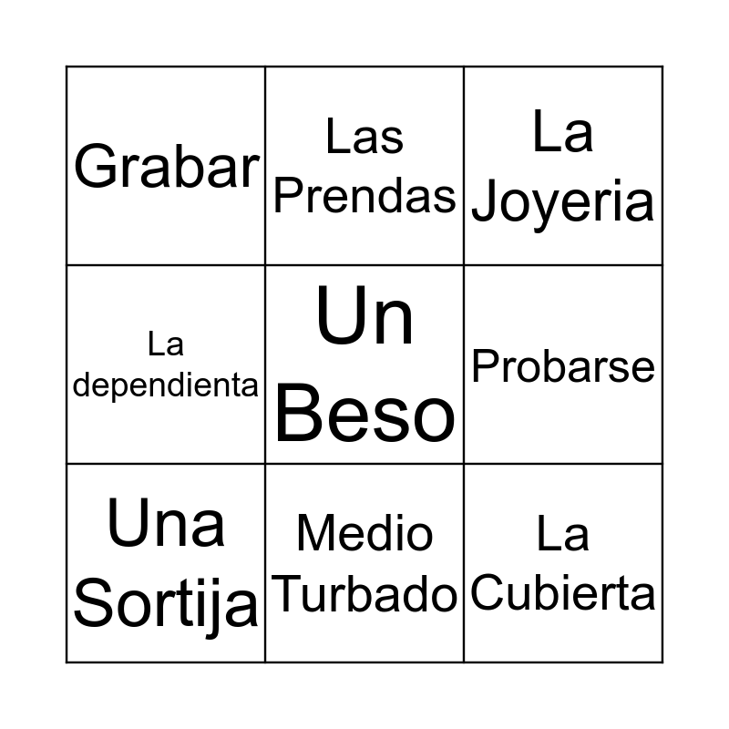 This bingo card has 9 words: Una Sortija, La Joyeria, Las Prendas, La dependienta, Grabar, Probarse, Un Beso, La Cubierta and Medio Turbado.