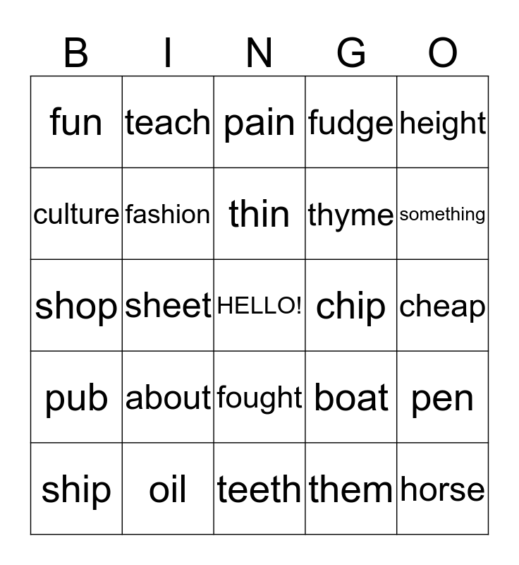 This bingo card has a free space and 24 words: about, oil, thin, ship, height, fun, culture, teach, chip, fought, thyme, shop, boat, pen, fashion, them, cheap, pain, something, sheet, horse, pub, fudge and teeth.