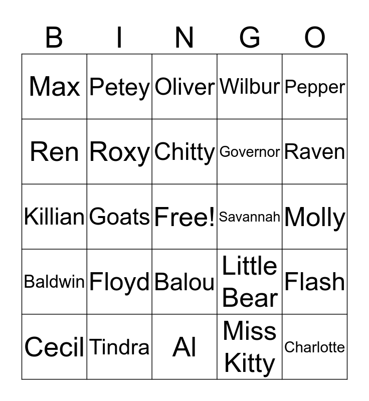 This bingo card has a free space and 24 words: Floyd, Tindra, Chitty, Cecil, Pepper, Max, Ren, Petey, Savannah, Balou, Governor, Killian, Little Bear, Flash, Roxy, Miss Kitty, Molly, Oliver, Raven, Goats, Charlotte, Baldwin, Wilbur and Al.