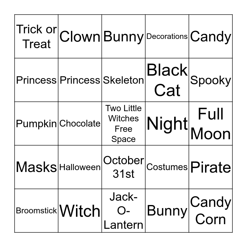 This bingo card has a free space and 24 words: Halloween, Witch, Skeleton, Broomstick, Candy, Trick or Treat, Princess, Clown, Night, October 31st, Black Cat, Pumpkin, Costumes, Pirate, Princess, Bunny, Full Moon, Bunny, Spooky, Chocolate, Candy Corn, Masks, Decorations and Jack-O-Lantern.