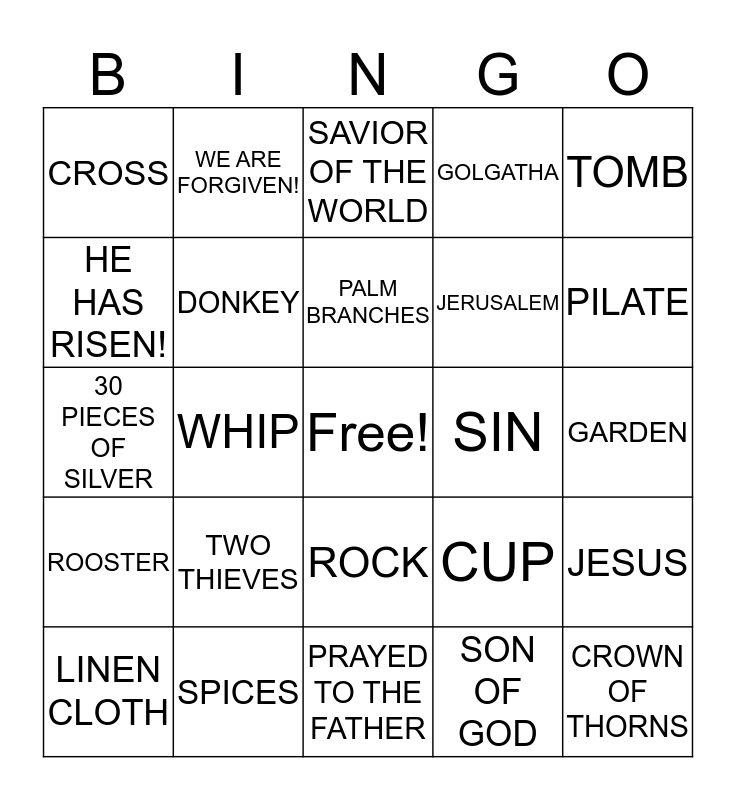 This bingo card has a free space and 24 words: TWO THIEVES, SPICES, PALM BRANCHES, LINEN CLOTH, TOMB, CROSS, HE HAS RISEN!, WE ARE FORGIVEN!, SIN, ROCK, JERUSALEM, 30 PIECES OF SILVER, CUP, JESUS, DONKEY, SON OF GOD, GARDEN, SAVIOR OF THE WORLD, PILATE, WHIP, CROWN OF THORNS, ROOSTER, GOLGATHA and PRAYED TO THE FATHER.