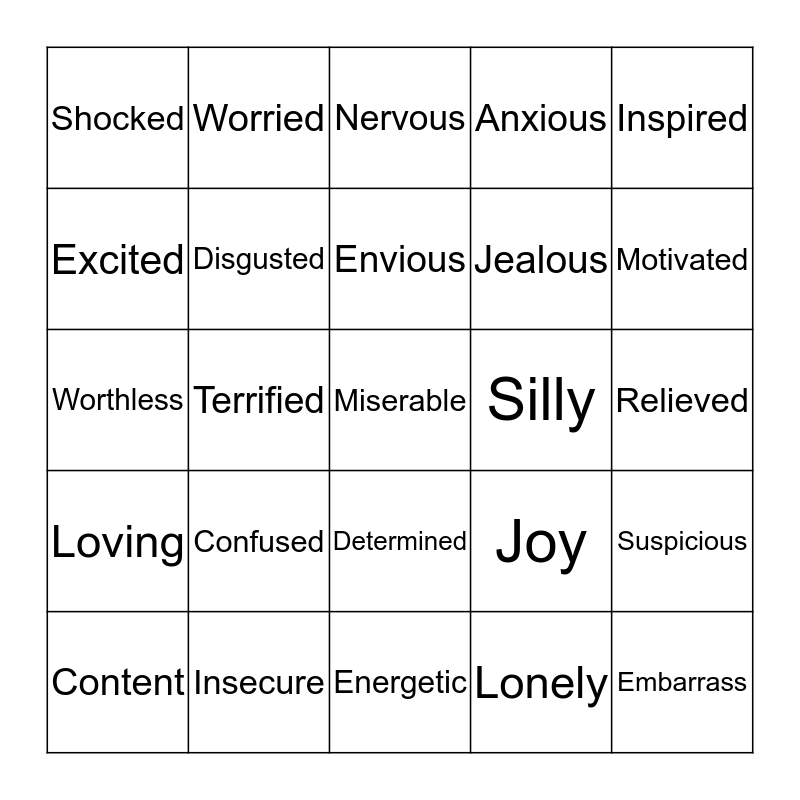 This bingo card has a free space and 24 words: Confused, Insecure, Envious, Content, Inspired, Shocked, Excited, Worried, Silly, Determined, Jealous, Worthless, Joy, Suspicious, Disgusted, Lonely, Relieved, Nervous, Motivated, Terrified, Embarrass, Loving, Anxious and Energetic.