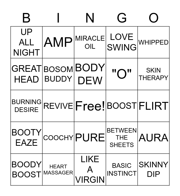 This bingo card has a free space and 24 words: COOCHY, HEART MASSAGER, BODY DEW, BOODY BOOST, WHIPPED, UP ALL NIGHT, GREAT HEAD, AMP, BOOST, PURE, "O", BURNING DESIRE, BETWEEN THE SHEETS, AURA, BOSOM BUDDY, BASIC INSTINCT, FLIRT, MIRACLE OIL, SKIN THERAPY, REVIVE, SKINNY DIP, BOOTY EAZE, LOVE SWING and LIKE A VIRGIN.