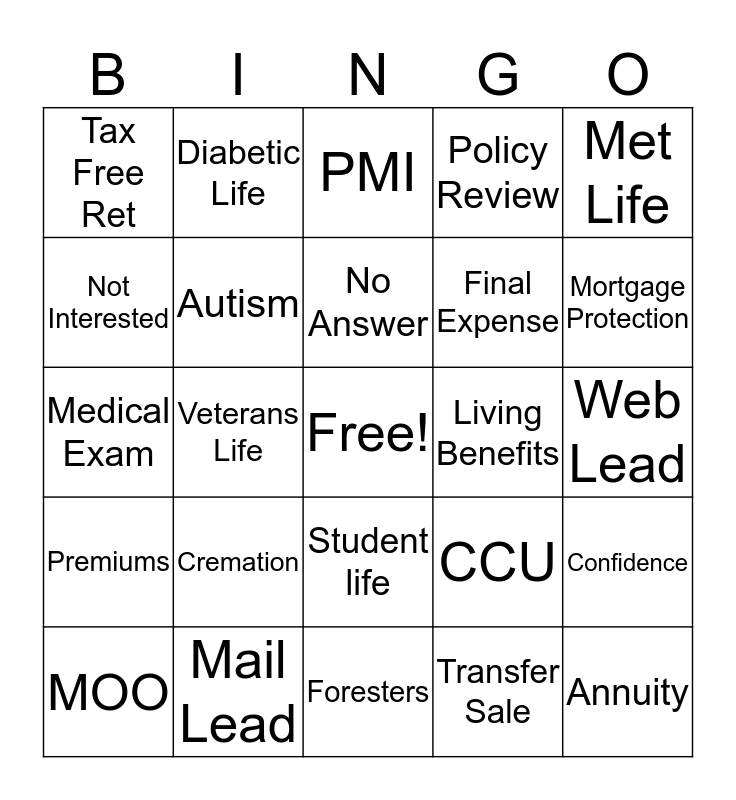 This bingo card has a free space and 24 words: Cremation, Mail Lead, No Answer, MOO, Met Life, Tax Free Ret, Not Interested, Diabetic Life, Living Benefits, Student life, Final Expense, Medical Exam, CCU, Confidence, Autism, Transfer Sale, Web Lead, PMI, Mortgage Protection, Veterans Life, Annuity, Premiums, Policy Review and Foresters.