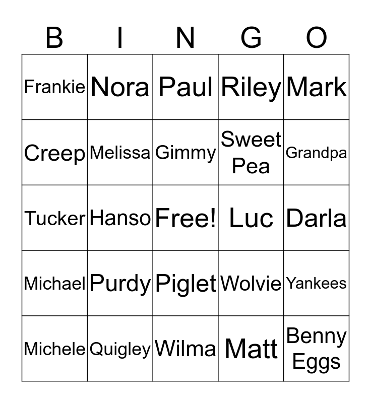 This bingo card has a free space and 34 words: Gina, Matt, Joe, Sue, Michael, Melissa, Mark, Michele, Nora, Leah, Gimmy, Paul, Chantal, Shoosh, Luc, Grandpa, Quigley, Tucker, Purdy, Wolvie, Piglet, Norman, Frankie, Darla, Wilma, Benny Eggs, Riley, CeCe, Sweet Pea, Creep, G2, Hanso, Yankees and Cubs.