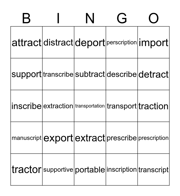 This bingo card has 25 words: export, portable, subtract, tractor, import, attract, support, distract, transport, extract, describe, inscribe, prescribe, prescription, transcribe, transcript, traction, deport, detract, extraction, transportation, supportive, manuscript, perscription and inscription.