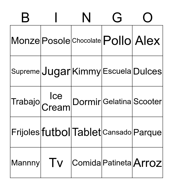 This bingo card has a free space and 24 words: futbol, Tv, Kimmy, Mannny, Alex, Monze, Supreme, Posole, Gelatina, Tablet, Escuela, Trabajo, Cansado, Parque, Jugar, Patineta, Scooter, Chocolate, Dulces, Ice Cream, Arroz, Frijoles, Pollo and Comida.