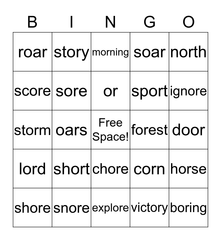 This bingo card has a free space and 29 words: shore, store, oars, before, roar, morning, sore, short, forest, snore, door, boring, explore, victory, ignore, more, chore, lord, north, storm, corn, fork, sport, score, soar, story, horse, or and chore.
