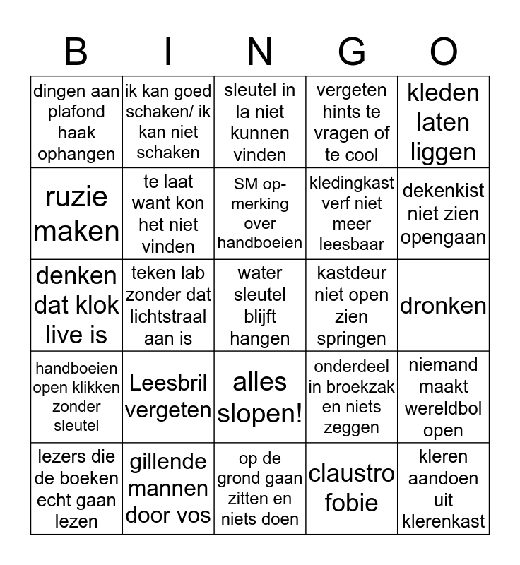 This bingo card has a free space and 24 words: Leesbril vergeten, gillende mannen door vos, SM op-merking over handboeien, lezers die de boeken echt gaan lezen, kleden laten liggen, dingen aan plafond haak ophangen, ruzie maken, ik kan goed schaken/ ik kan niet schaken, kastdeur niet open zien springen, alles slopen!, kledingkast verf niet meer leesbaar, denken dat klok live is, onderdeel in broekzak en niets zeggen, niemand maakt wereldbol open, te laat want kon het niet vinden, claustro fobie, dronken, sleutel in la niet kunnen vinden, dekenkist niet zien opengaan, teken lab zonder dat lichtstraal aan is, kleren aandoen uit klerenkast, handboeien open klikken zonder sleutel, vergeten hints te vragen of te cool and op de grond gaan zitten en niets doen.
