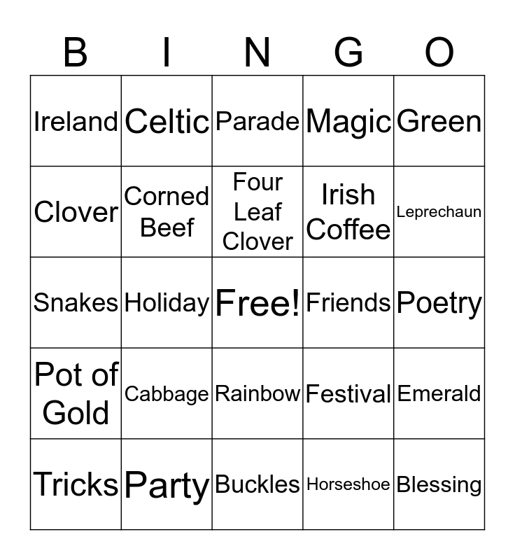 This bingo card has a free space and 52 words: Blarney, Blessing, Brogue, Buckles, Cabbage, Celebrate, Celtic, Charm, Clover, Coins, Corned Beef, Dublin, Emerald, Festival, Flute, Folklore, Four Leaf Clover, Friends, Gaelic, Green, Holiday, Horseshoe, Ireland, Irish Coffee, Irish Stew, Jig, Kiss me I'm Irish, Legend, Leprechaun, Limerick, Luck, Magic, March, Mischief, Music, Parade, Party, Patrick, Patty, Pinch Me, Plaid, Poetry, Pot of Gold, Potatoes, Rainbow, Saint, Shamrock, Snakes, SurprisesTop Hat, Tradition, Tricks and Wishes.