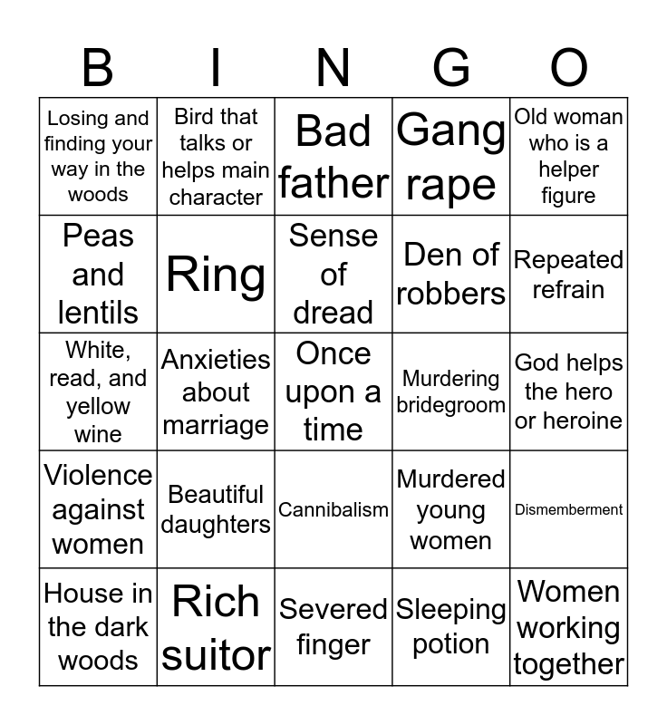 This bingo card has a free space and 24 words: Beautiful daughters, Rich suitor, Sense of dread, House in the dark woods, Old woman who is a helper figure, Losing and finding your way in the woods, Peas and lentils, Bird that talks or helps main character, Murdering bridegroom, Cannibalism, Den of robbers, White, read, and yellow wine, Murdered young women, Dismemberment, Ring, Sleeping potion, God helps the hero or heroine, Bad father, Repeated refrain, Anxieties about marriage, Women working together, Violence against women, Gang rape and Severed finger.