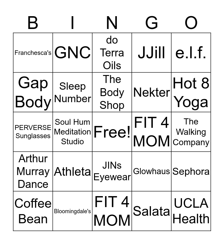 This bingo card has a free space and 24 words: Athleta, Bloomingdale's, The Body Shop, Coffee Bean, e.l.f., Franchesca's, Gap Body, GNC, FIT 4 MOM, JINs Eyewear, Nekter, PERVERSE Sunglasses, Glowhaus, Sephora, Sleep Number, Salata, The Walking Company, do Terra Oils, Hot 8 Yoga, Soul Hum Meditation Studio, UCLA Health, Arthur Murray Dance, JJill and FIT 4 MOM.