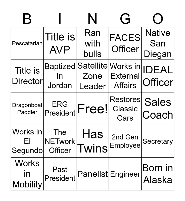 This bingo card has a free space and 31 words: Panelist, Moderator, ERG President, Pioneer Officer, Pescatarian, Ran with bulls, Baptized in Jordan, 2nd Gen Employee, Restores Classic Cars, Engineer, Sales Coach, Born in Alaska, Plays Piano, OASIS Officer, IDEAL Officer, Treasurer, Secretary, The NETwork Officer, Works in El Segundo, Has Twins, Native San Diegan, Speaks a 2nd language, Works in Mobility, Title is AVP, Works in External Affairs, Title is Director, FACES Officer, Dragonboat Paddler, Past President, Satellite Zone Leader and Decorated Christmas Stocking.