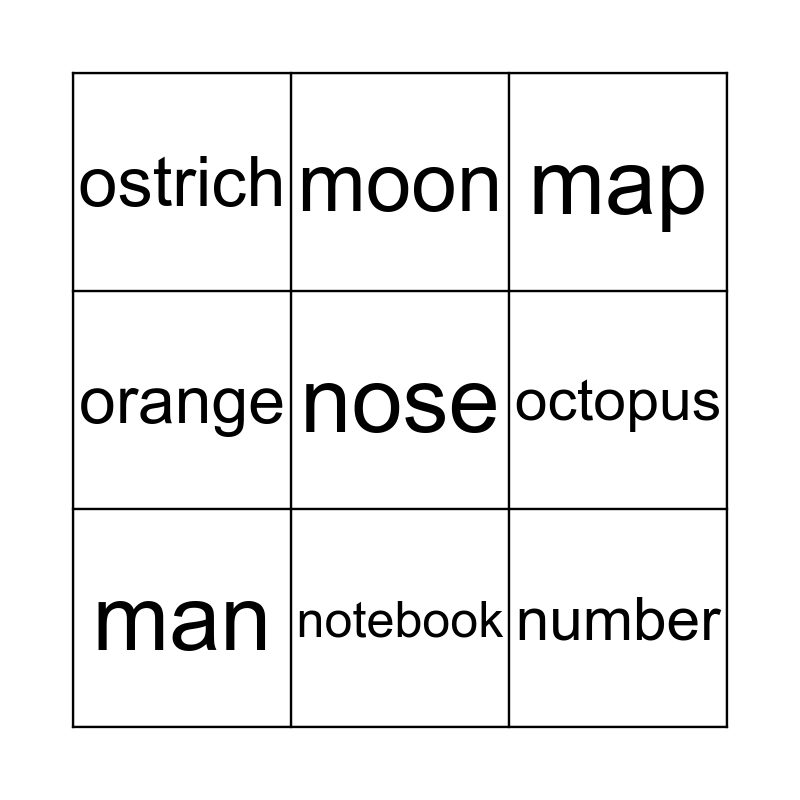 This bingo card has 9 words: man, map, moon, orange, ostrich, octopus, nose, number and notebook.