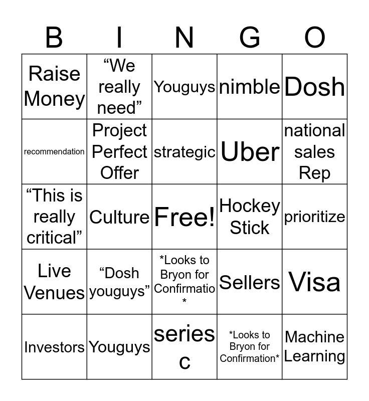 This bingo card has a free space and 24 words: “Dosh youguys”, Youguys, strategic, Investors, Dosh, Raise Money, recommendation, “We really need”, Hockey Stick, *Looks to Bryon for Confirmatio *, Uber, “This is really critical”, Sellers, Visa, Project Perfect Offer, *Looks to Bryon for Confirmation*, prioritize, Youguys, national sales Rep, Culture, Machine Learning, Live Venues, nimble and series c.