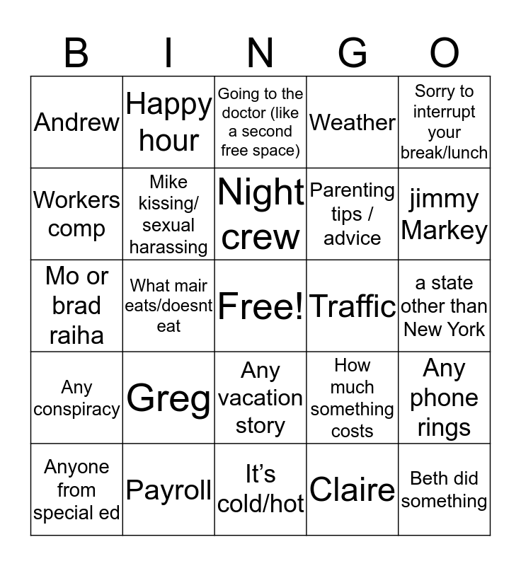 This bingo card has a free space and 24 words: Greg, Payroll, Night crew, Anyone from special ed, Sorry to interrupt your break/lunch, Andrew, Workers comp, Happy hour, Traffic, Any vacation story, Parenting tips / advice, Mo or brad raiha, How much something costs, Any phone rings, Mike kissing/ sexual harassing, Claire, a state other than New York, Going to the doctor (like a second free space), jimmy Markey, What mair eats/doesnt eat, Beth did something, Any conspiracy, Weather and It’s cold/hot.