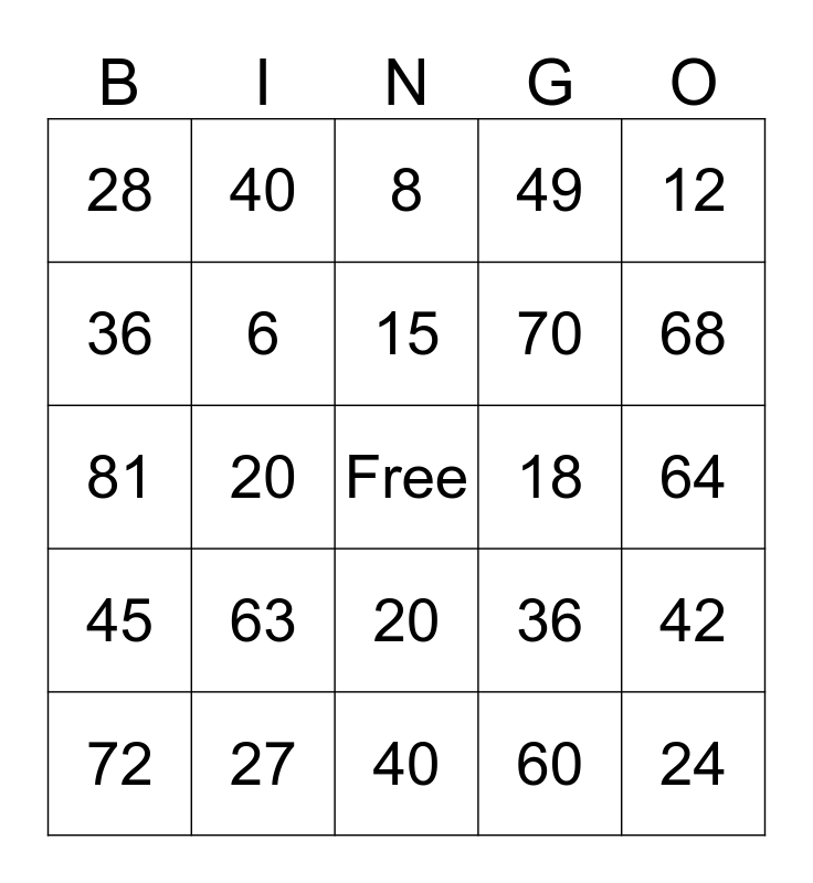 This bingo card has a free space and 24 words: 72, 63, 15, 60, 12, 28, 40, 8, 18, 64, 81, 6, 36, 42, 36, 27, 40, 49, 68, 45, 20, 20, 70 and 24.