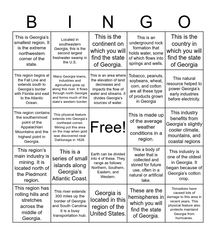 This bingo card has a free space and 24 words: This region has rolling hills and stretches across the middle of Georgia., This is a series of small islands along Georgia’s Atlantic Coast., This is an area where the elevation of land decreases and impacts the flow of water and streams. It divides Georgia’s sources of water., These are the hemispheres in which you will find the state of Georgia., This is the country in which you will find the state of Georgia, This is Georgia’s smallest region. It is the extreme northwestern corner of the state., Located in southeastern Georgia, this is the second largest freshwater swamp in the U.S., This is the continent on which you will find the state of Georgia., This is made up of the average weather conditions in a region., This industry benefits from Georgia’s slightly cooler climate, mountains, and coastal regions, This region contains the southernmost point of the Appalachian Mountains and the highest point in Georgia., Many Georgia towns, industries and agriculture grew up along this river. It flows through north Georgia and forms much of the state’s western border., This a body of water that is collected and stored for future use, often in a natural or artificial lake., This industry is one of the oldest in Georgia. It began because of Georgia’s cotton crop., This region begins at the Fall Line and extends south to Georgia’s border with Florida and east to the Atlantic Ocean., This river extends 300 miles up the border of Georgia and South Carolina. It is a busy transportation hub., Georgia is located in this region of the United States., This is an underground rock formation that holds water, some of which flows into springs and wells., This natural resource helped to power Georgia’s early industries before electricity., This region’s main industry is mining. It is located north of the Piedmont region., This physical feature extends into Georgia’s northeast corner. Mining put this area on the map when gold was discovered near Dahlonega in 1828., Earth can be divided into 4 of these. They range as follows: Northern, Southern, Eastern, and Western., Tobacco, peanuts, soybeans, wheat, corn, and cotton are all these type of products grown in Georgia and Tornadoes have caused lots of damage to this area in recent years. This physical feature also protects mainland Georgia from hurricanes..