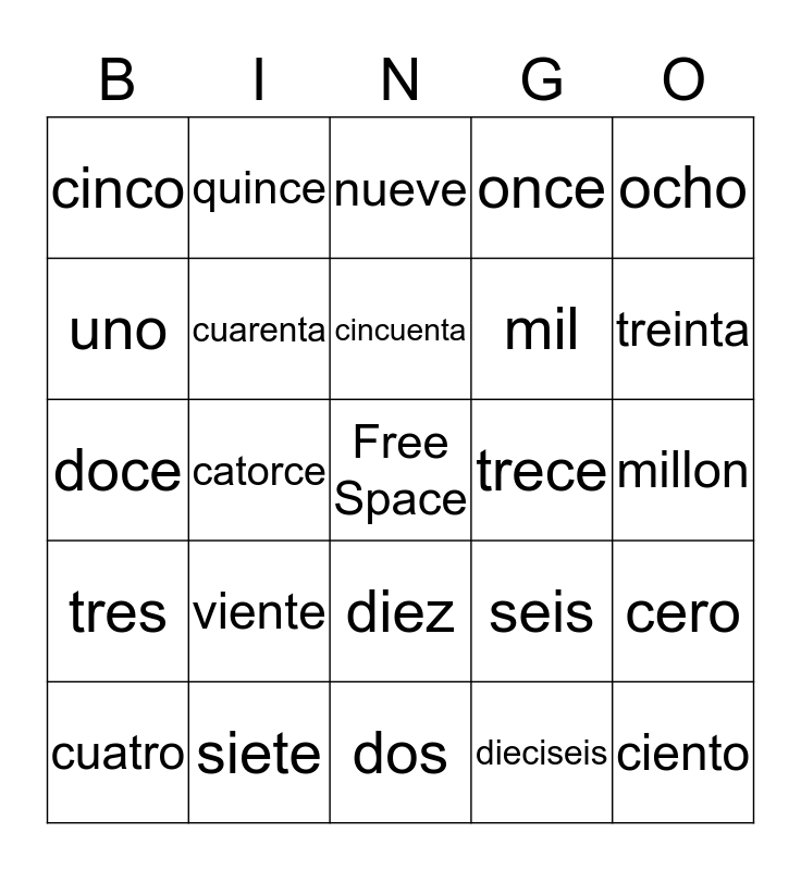 This bingo card has a free space and 24 words: viente, siete, cincuenta, cuatro, ocho, cinco, uno, quince, trece, diez, mil, doce, seis, cero, cuarenta, dieciseis, millon, nueve, treinta, catorce, ciento, tres, once and dos.