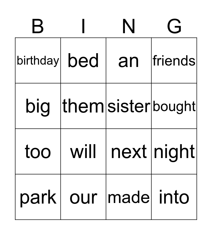 This bingo card has 26 words: Free!, can, bought, brother, big, birthday, them, bed, made, name, too, next, dog, lots, night, not, friends, into, an, park, will, car, our, do, sister and be.