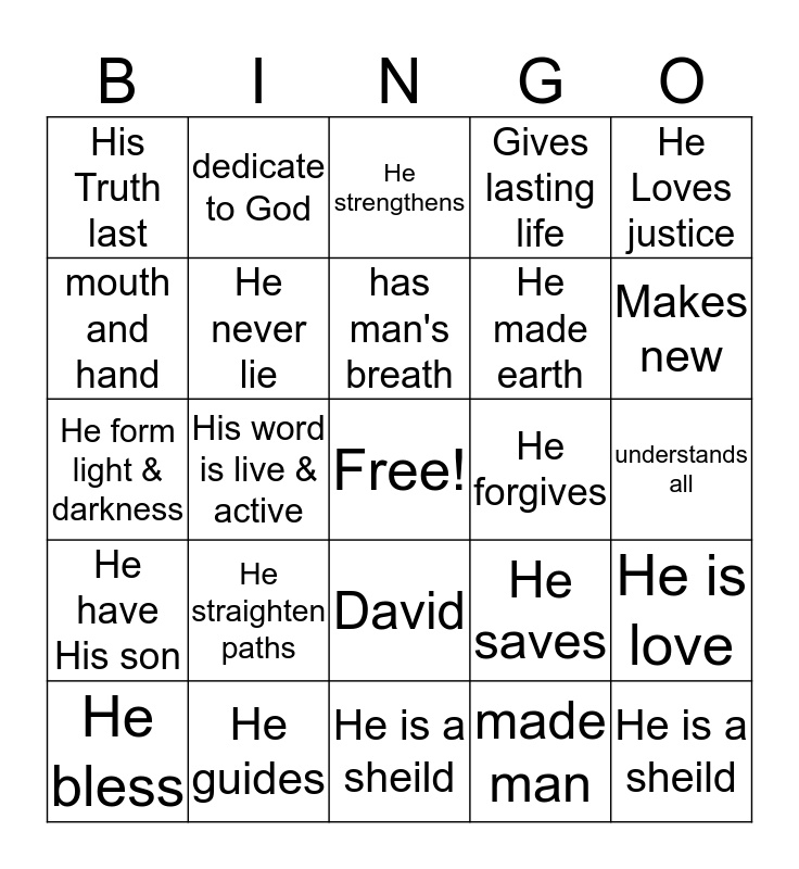 This bingo card has a free space and 24 words: He straighten paths, He guides, has man's breath, He bless, He Loves justice, His Truth last, mouth and hand, dedicate to God, He forgives, David, He made earth, He form light & darkness, He saves, He is love, He never lie, made man, understands all, He strengthens, Makes new, His word is live & active, He is a sheild, He have His son, Gives lasting life and He is a sheild.