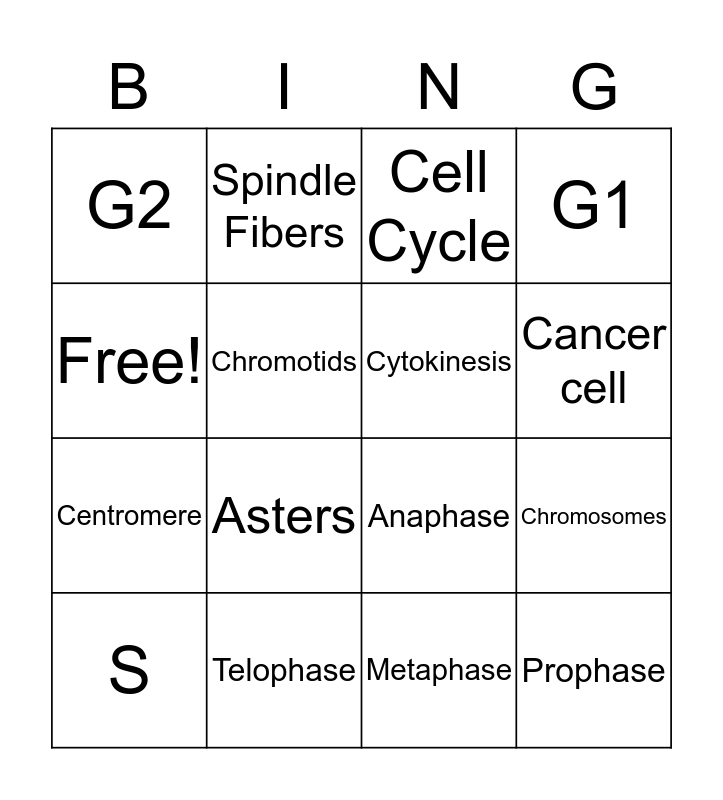 This bingo card has 16 words: Telophase, Chromosomes, Cell Cycle, G2, Centromere, Spindle Fibers, Anaphase, Metaphase, Free!, Chromotids, S, G1, Asters, Cancer cell, Cytokinesis and Prophase.