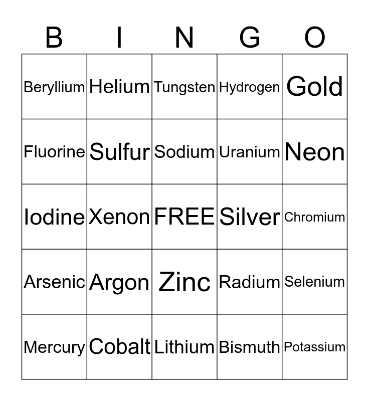 This bingo card has a free space and 24 words: Argon, Cobalt, Sodium, Mercury, Gold, Beryllium, Fluorine, Helium, Silver, Zinc, Uranium, Iodine, Radium, Selenium, Sulfur, Bismuth, Chromium, Tungsten, Neon, Xenon, Potassium, Arsenic, Hydrogen and Lithium.