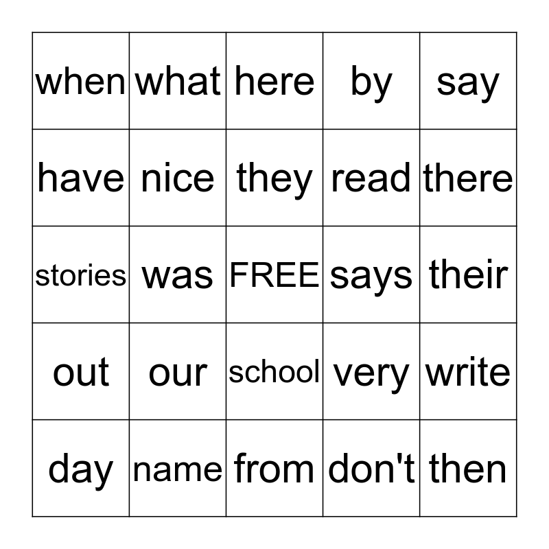This bingo card has a free space and 24 words: our, name, they, day, say, when, have, what, says, school, read, stories, very, write, nice, don't, their, here, there, was, then, out, by and from.